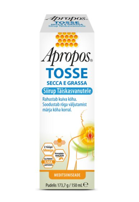 Sobib nii kuiva ja püsiva kui ka märja köha korral, rahustab köha, leevendab ärritust ja soodustab bronhide sekretsioonide voolavust, hõlbustades röga väljutamist. Lisaks on tänu preparaadis sisalduvale meele ja eeterlikele õlidele Apropos Tosse köhasiirupil meeldiv maitse, mis pakub mõnusat kergendustunnet. Sobib täiskasvanutele ja üle 12-aastastele lastele.