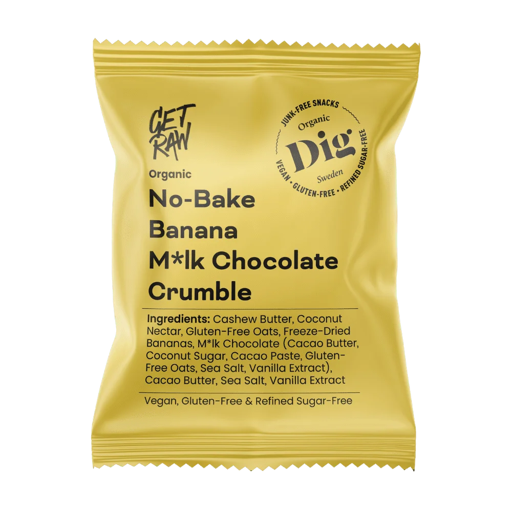 India pähklivõi, kookospähkli nektar, gluteenivabad kaerahelbed, külmkuivatatud banaanid 8%, hele šokolaad 6% (kakaovõi, kookossuhkur, kakaopasta, gluteenivaba kaerahelbed, meresool, vaniljeekstrakt, kakaosisaldus 55%), kakaovõi, meresool, vaniljeekstrakt. Orgaaniline.