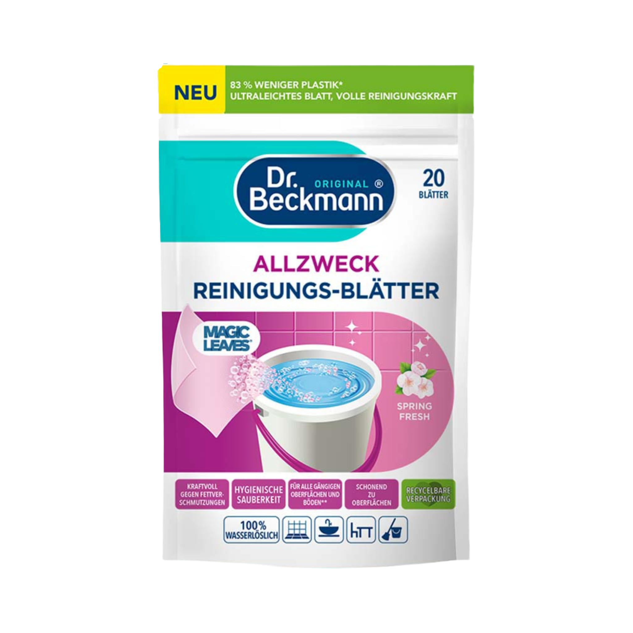 Universaalsed Saksa puhastuslehed Dr. Beckmann on 100% vees lahustuvad. Tänu taaskasutatavatele pakenditele sisaldavad lehed 83% vähem plastikut võrreldes traditsiooniliste vedelate universaalsete puhastusvahenditega plastpudelites, mida on pakendiühiku kohta kasutatud võrreldava arvuga. Kõigi levinud pindade tõhusaks ja õrnaks puhastamiseks.