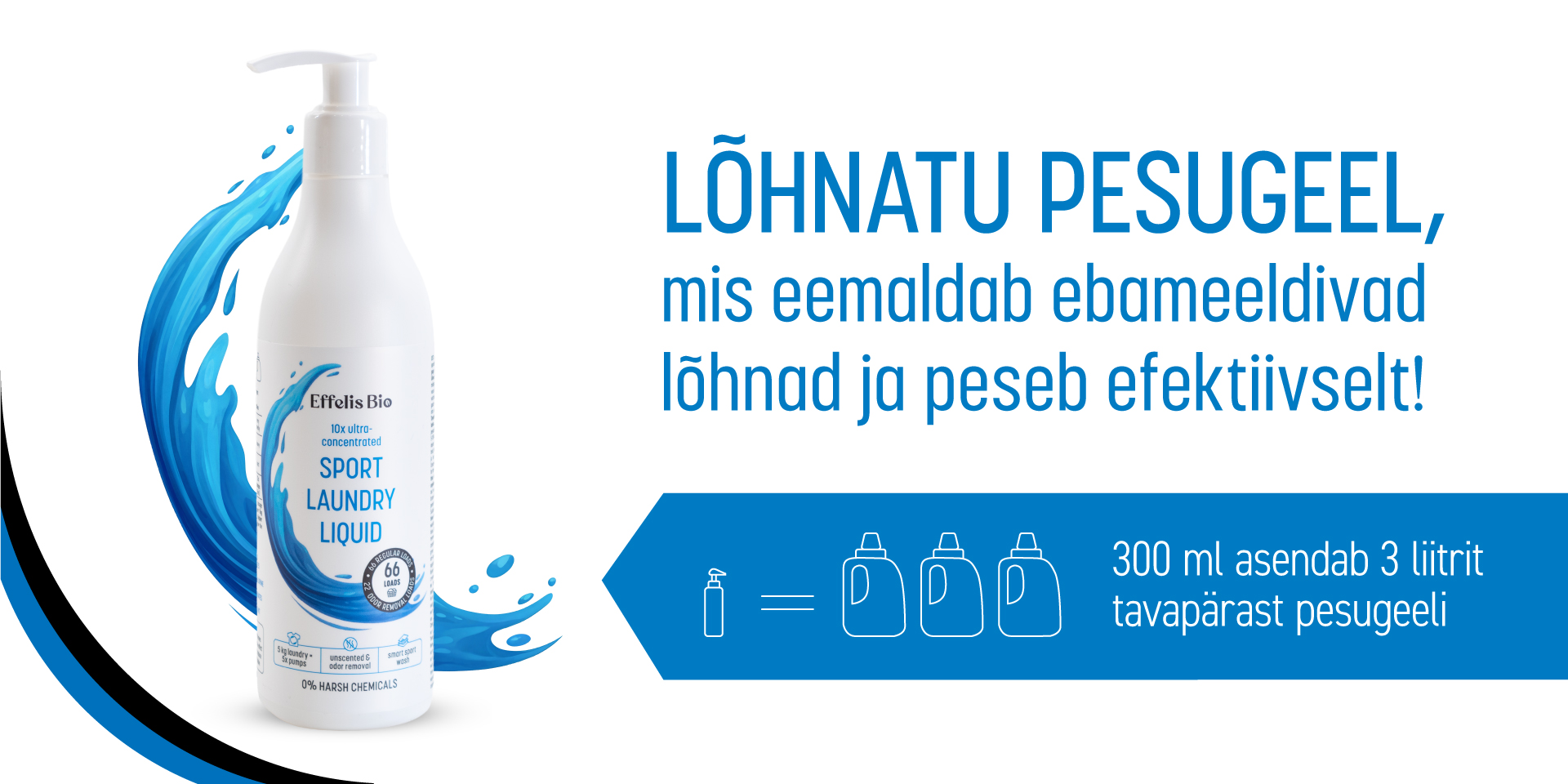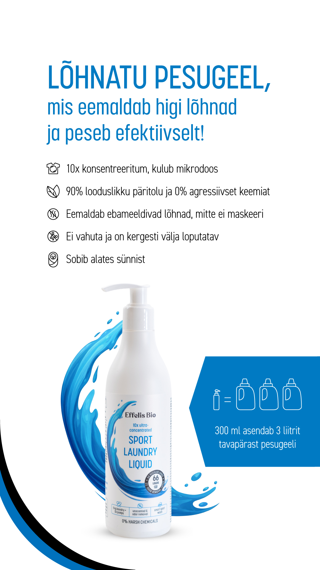 - Lõhnatu spordiriiete tavapesu pesugeel, millega on võimalik teostada tavaannusest 3x kõrgema doseeringuga ebameeldivate lõhnade (mustus, niiskus, higi, uriin) lõhnaeemaldus pesu. Eestis välja töötatud spetsiaalne ja ainulaadne pesugeeli retsept, mis on muuhulgas võimeline eemaldama orgaanilisi lõhnu molekulaarsel tasandil, vajaduseta neid maskeerimata teiste aroomidega.