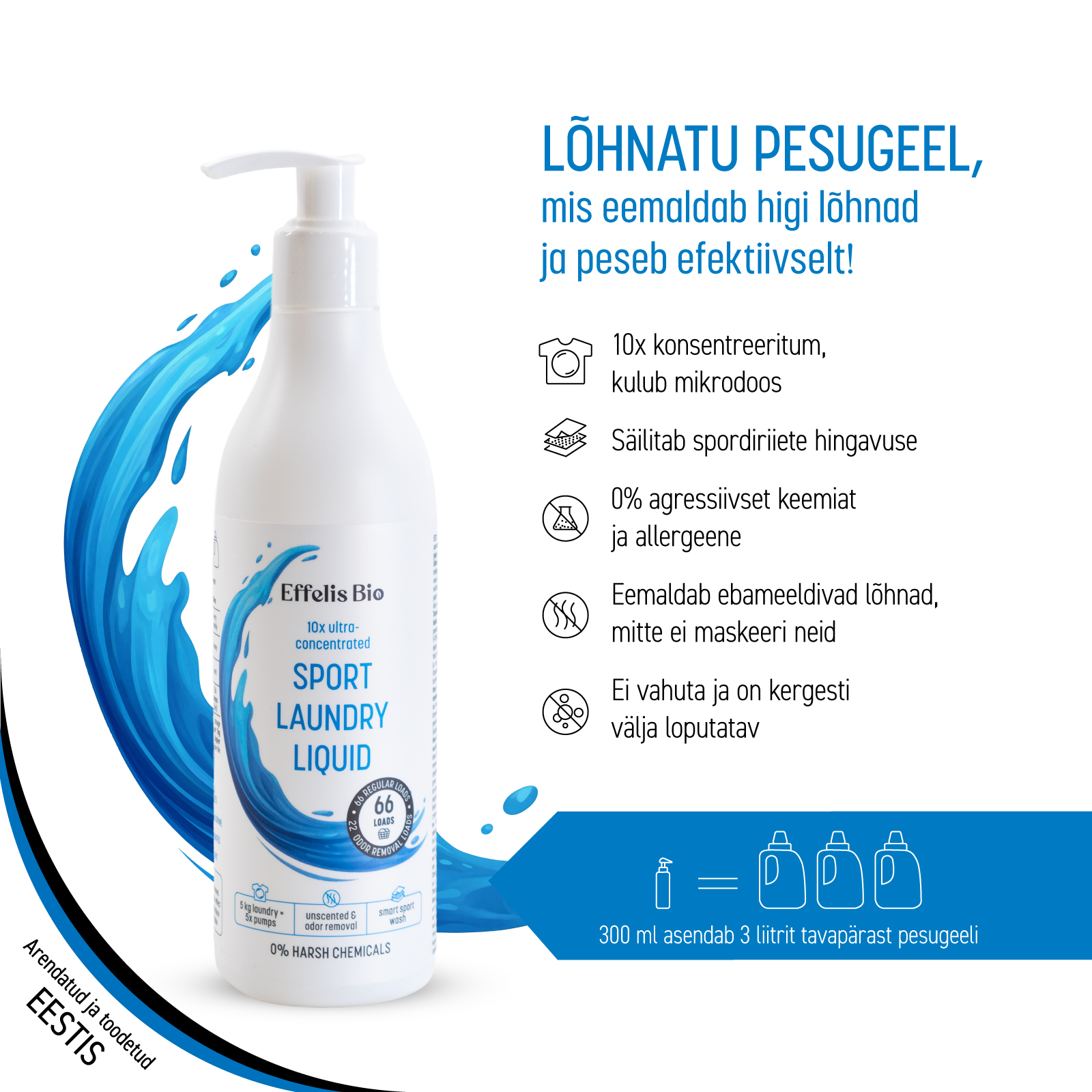 PEAMISED EELISED: Täpne ja lihtne doseerimine, Eemaldab tõhusalt higi ja niiskuse lõhnad, Efektiivne, kuid õrn keskkonnale ja tervisele, Ei maskeeri ebameeldivaid lõhnu teiste aroomidega, Sisaldab veepehmendajat, Ensüümaatiline, Säilitab kangaste värvid, Vähevahutav ja kergesti väljaloputatav, Hoiab ära katlakivi kogunemise pesumasinasse, On kiiretoimeline, Ökonoomne, Koostisosad on kergesti biolagunevad, Orgaaniline, Vegan ja julmusevaba, GMO vaba, Vähem jäätmeid.