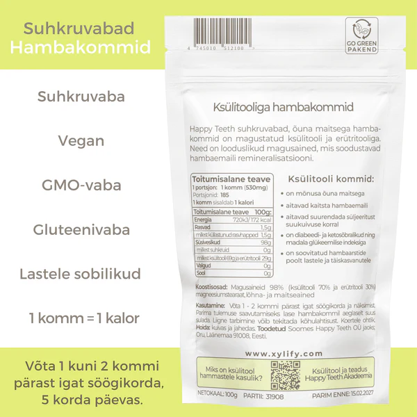 Keskkonnasõbralikkus: Toode on pakendatud biolagunevasse pakendisse, mis laguneb õigetes tingimustes looduslikeks komponentideks. See aitab vähendada prügi hulka ja keskkonnakoormust. Happy Teeth ksülitooliga hambakommid hoolitsevad ühtaegu nii hammaste kui ka looduse eest.