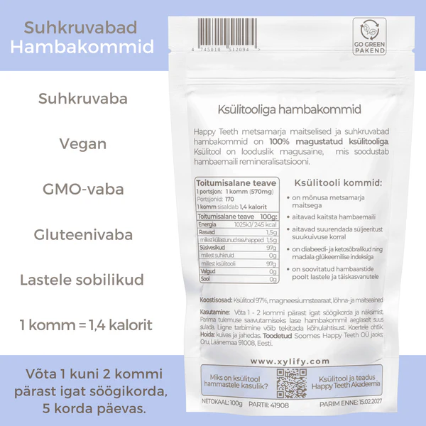 Happy Teeth metsamarjamaitselised hambakommid on maitsev ja tõhus viis igapäevaseks suuhoolduseks. Pastillid on magustatud 100% ksülitooliga, mis annab neile loomuliku magusa maitse ilma lisatud suhkruta. Ksülitool aitab vähendada hambakaariese riski, toetab hambaemaili tugevnemist ning aitab neutraliseerida happelist keskkonda suus pärast söömist. Metsamarjane maitse muudab pastillid meeldivaks nii lastele kui ka täiskasvanutele ning sobib kasutamiseks igal ajal, nii päeval kui ka öösel.