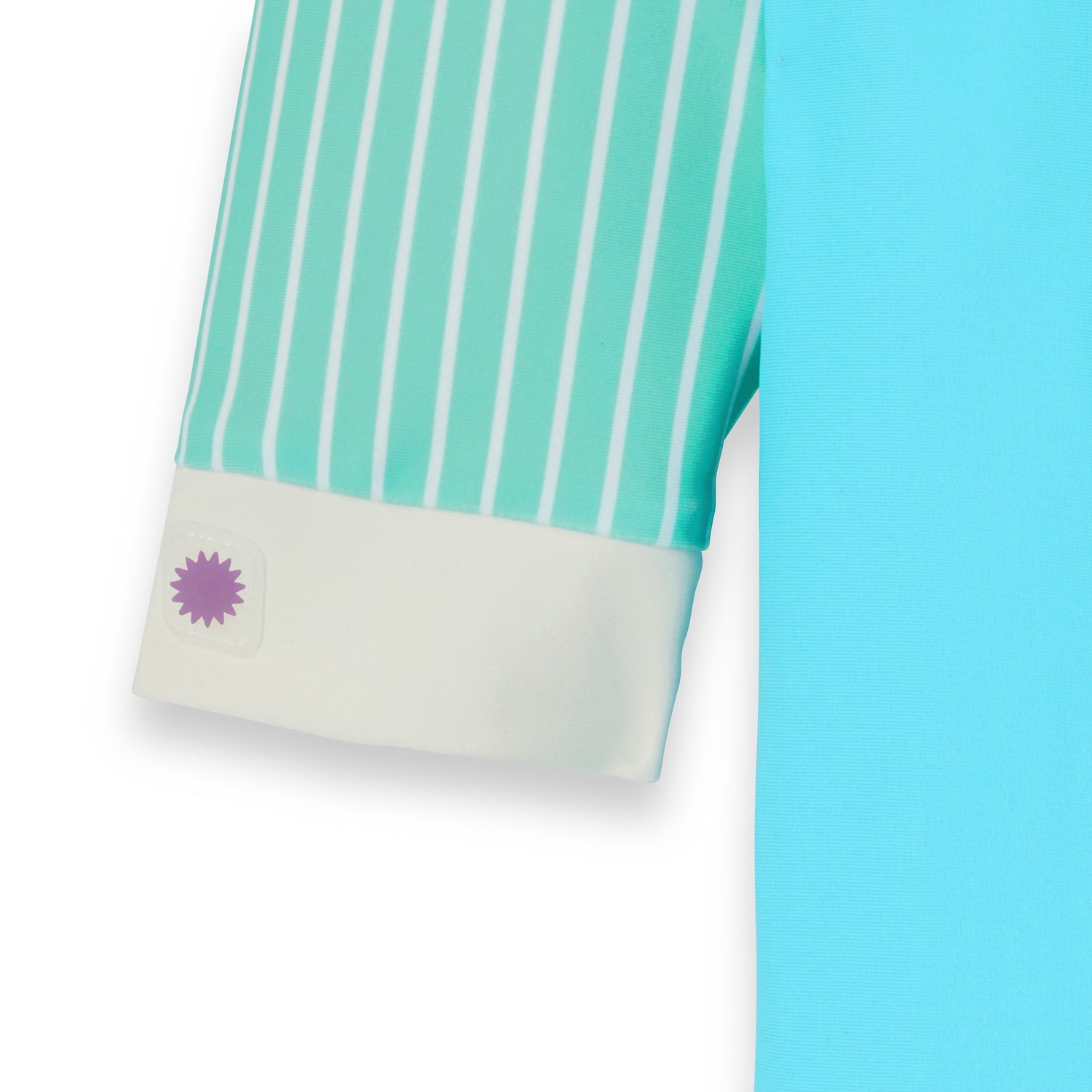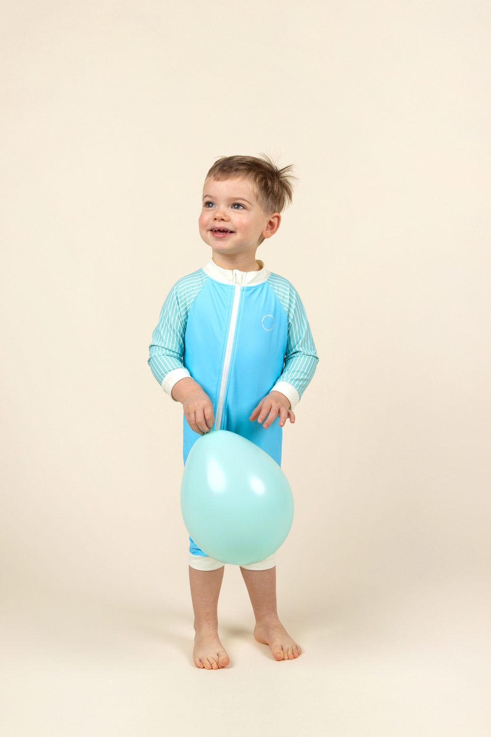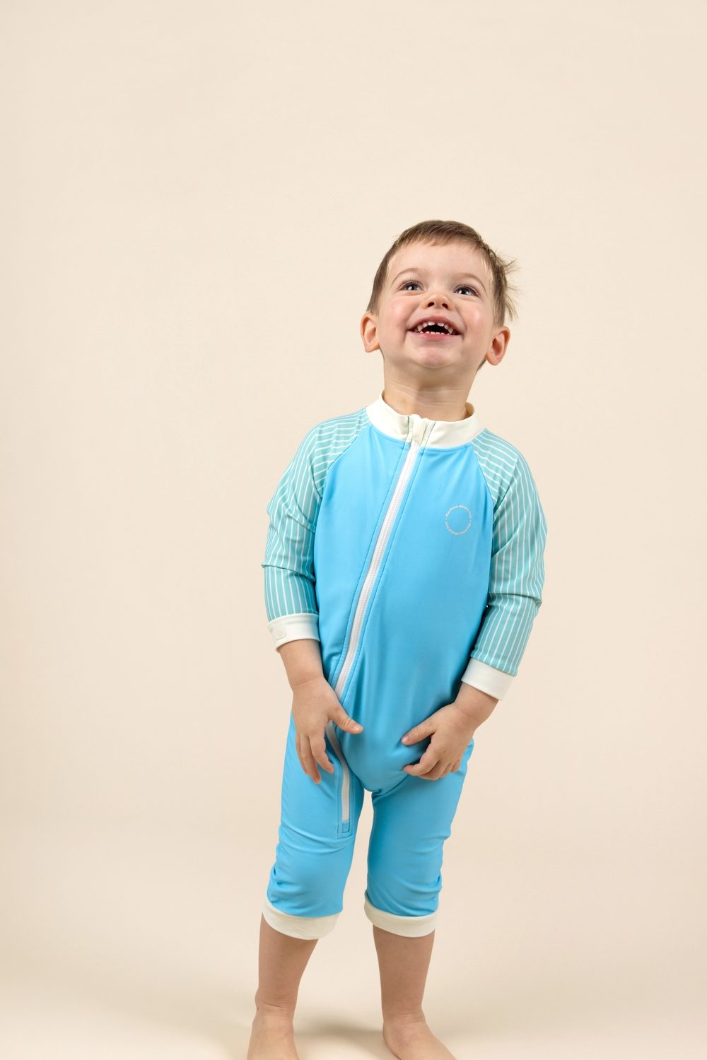 UPF 50+ kangas pakub täielikku kaitset kahjulike UV-kiirte eest, aidates hoida laste tundlikku nahka turvalisena. Keskmise pikkusega varrukad ja sääred tagavad suurema katvuse ning täispikk lukk kaelusest kuni jalani teeb riietamise ja mähkmevahetuse lihtsaks ka kõige püsimatumate beebide puhul.