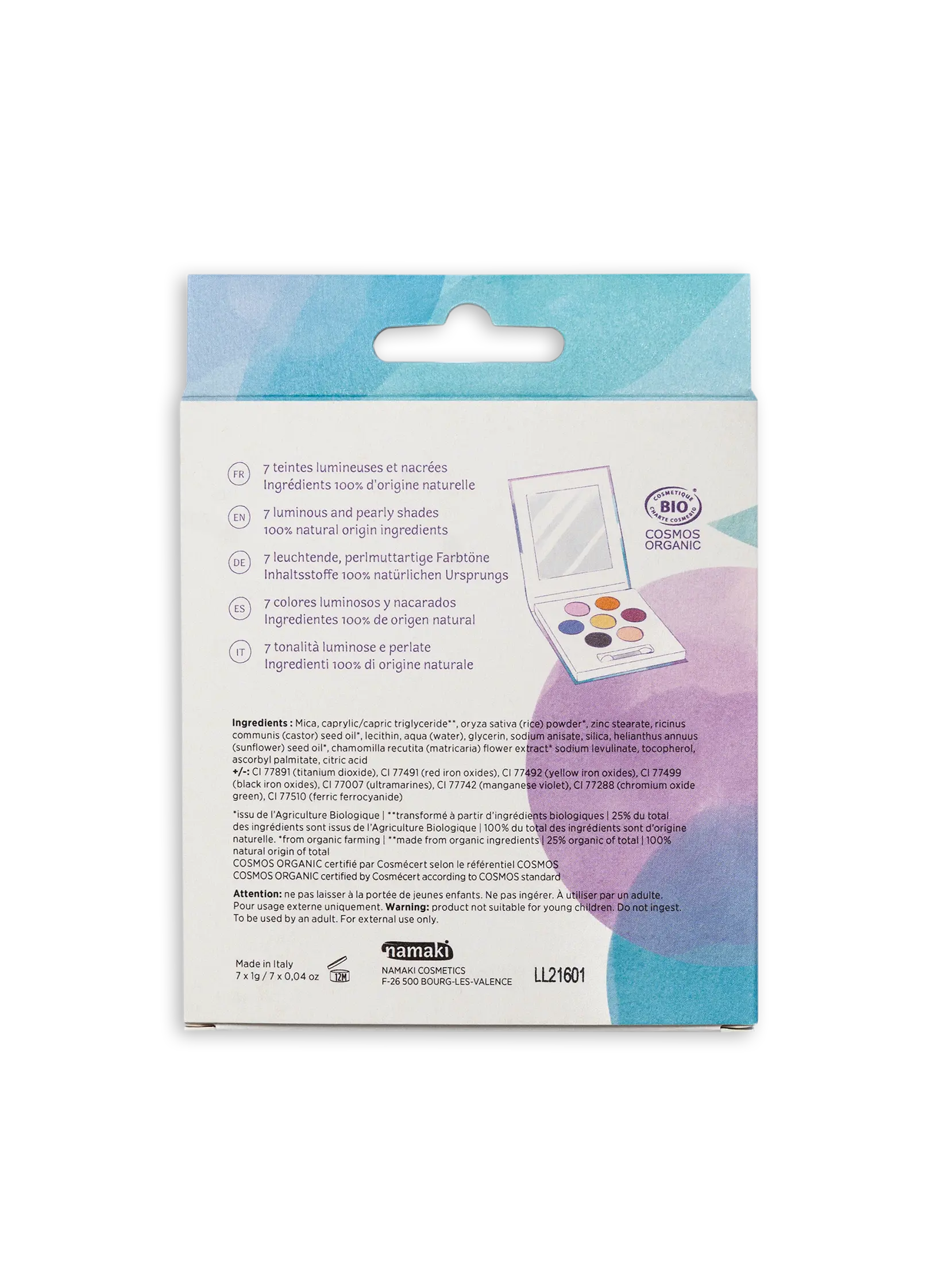 Palett, mis sisaldab kahe otsaga aplikaatorit, peeglit ja 7 helendavat pärlmutrist lauvärvi.