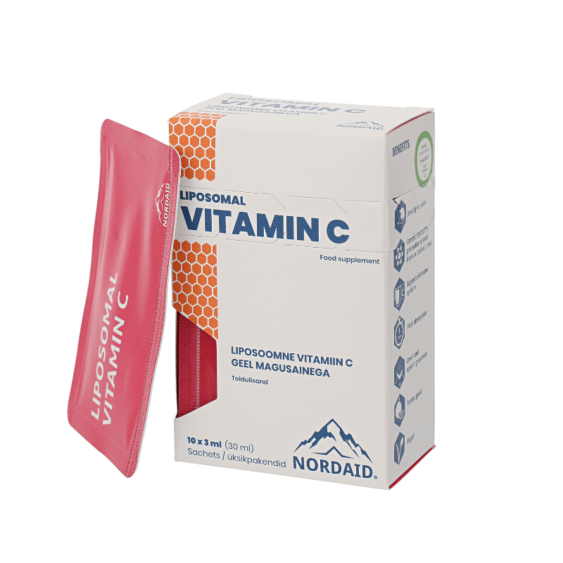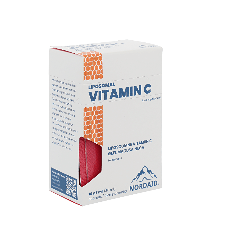 Nordaid´i liposoomne vitamiin C pakub revolutsioonilist viisi sinu tervise parandamiseks, kuna sellel on mitmeid kordi parem imendumisvõime kui traditsioonilistel kapseldatud või tableti kujul olevatel vitamiinidel. Liposoomne kohaletoimetamine tähendab, et vitamiin C molekulid on kapseldatud vitamiini kaitsvatesse liposoomidesse. Need aitavad vitamiinil minna mööda sinu seedetraktist ja kaitsevad vitamiin C-d hävimise eest. Läbi vereringe transporditakse vitamiin C otse sinu rakku. See on põhjus, miks liposoomsel vitamiinil on märgatavalt kõrgem bioaktiivsus ja miks see vähendab soole talumatust C vitamiini suhtes.