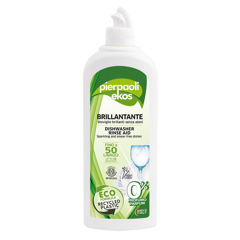 Pierpaoli Ekos nõudepesumasina loputusvahend, mis sobib igasuguse karedusega veele. Jätab nõud kuivaks ja läikivaks, ilma katlakivi jääkide ja triipudeta. 97% koostisosadest on looduslikku päritolu. Tootel on ICEA sertifikaat, mis garanteerib, et see ei sisalda inimestele ega keskkonnale ohtlikke aineid. Nikkel, kroom ja koobal väärtused <0.00004%. Loputusvedelikku jätkub kuni 50 pesuks.