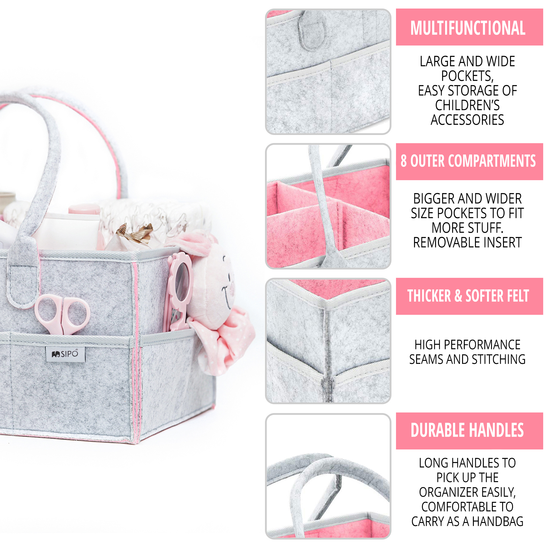 SIPO beebitarvete korraldaja on ideaalne lahendus, et hoida beebi hooldusvahendid käepärast ja korras. Mitmete taskute ja lahtritega disain võimaldab hõlpsalt organiseerida mähkmeid, niiskeid salvrätte, kreeme ja muid tarvikuid. Valmistatud kvaliteetsest vildist, on see vastupidav, mustust hülgav ja beebi naha vastu õrn. Tänu kergele konstruktsioonile ja tugevatele sangadele on seda lihtne kaasas kanda ja igas ruumis kasutada.