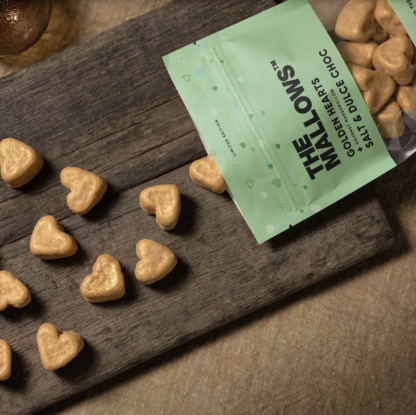 Kuldsed südamed on vaniljevahukommid, mis on kaetud karamelliseeritud valge šokolaadi, krõmpsuvate meresoolatükkidega ja lõpuks kullapuruga. Ideaalne kombinatsioon neile, kes soovivad erakordset eksklusiivse šokolaadi maitseelamust.