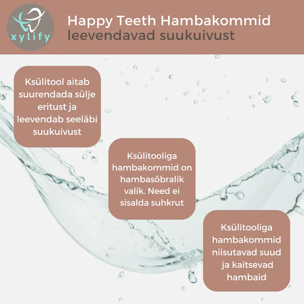 Kasutamine: Eesti Hambaarstide Liit soovitab Xylify Happy Teeth ksülitooli ja erütritooliga hambakomme igapäevases suuhooldusrutiinis. Soovitatav on võtta 1–2 pastilli pärast iga sööki, suupistet või jooki. Lase pastillidel aeglaselt suus lahustuda. Väike ja mugav formaat võimaldab kasutada neid igas olukorras.